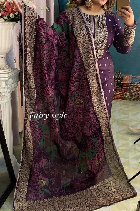 This Pure Cotton Unstitched Afsan and Screen Print Three-Piece Set for women offers an ethnic and stylish design, perfect for all seasons. The set includes an unstitched fabric for a customized fit, allowing flexibility in size and style. The fabric is made of high-quality pure cotton, providing comfort and breathability for year-round wear. The screen print detailing enhances its visual appeal, making it a fashionable choice for various occasions. Ideal for women seeking an ethnic and trendy look, this set can be tailored to your preference and is versatile for casual or semi-formal events.