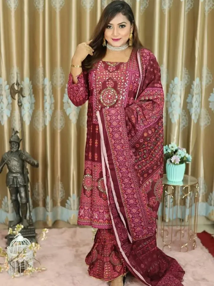 রেডিমেড গাররা থ্রি পিস কামিজ: লিলেন সালোয়ার: লিলেন ওড়না : কটন