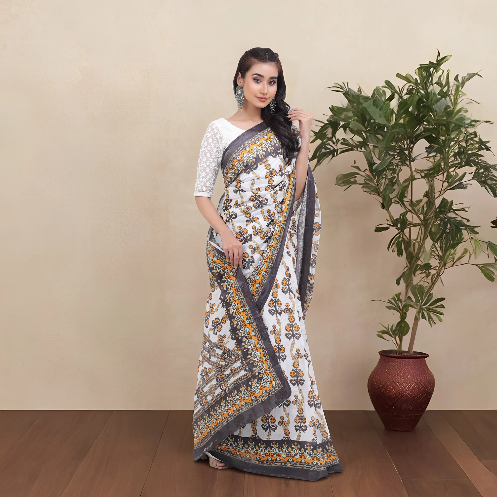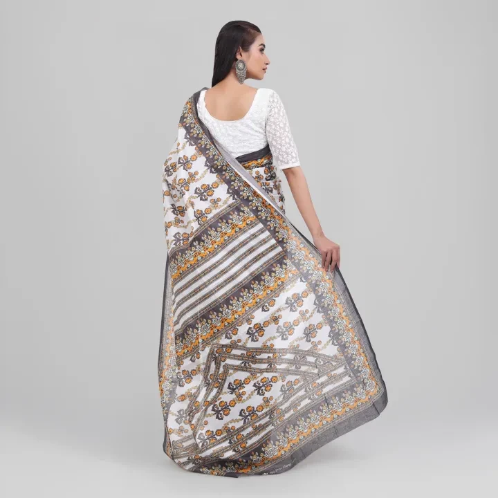 Elevate your style with this Fashionable Digital Printed Saree, designed for both elegance and comfort. Featuring a graceful white body with an intricate orange all-over print, this saree perfectly blends tradition with modern aesthetics. The contrasting aanchal and border add a striking touch, making it an ideal choice for festive occasions, parties, and special events. Crafted from high-quality fabric, it drapes beautifully, ensuring a refined and graceful look. Pair it with statement jewelry and heels for a stunning ensemble.