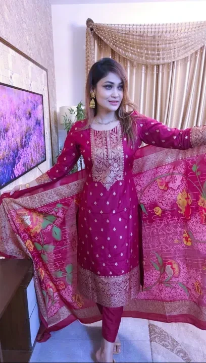 This Pure Cotton Unstitched Afsan and Screen Print Three-Piece Set for women offers an ethnic and stylish design, perfect for all seasons. The set includes an unstitched fabric for a customized fit, allowing flexibility in size and style. The fabric is made of high-quality pure cotton, providing comfort and breathability for year-round wear. The screen print detailing enhances its visual appeal, making it a fashionable choice for various occasions. Ideal for women seeking an ethnic and trendy look, this set can be tailored to your preference and is versatile for casual or semi-formal events.